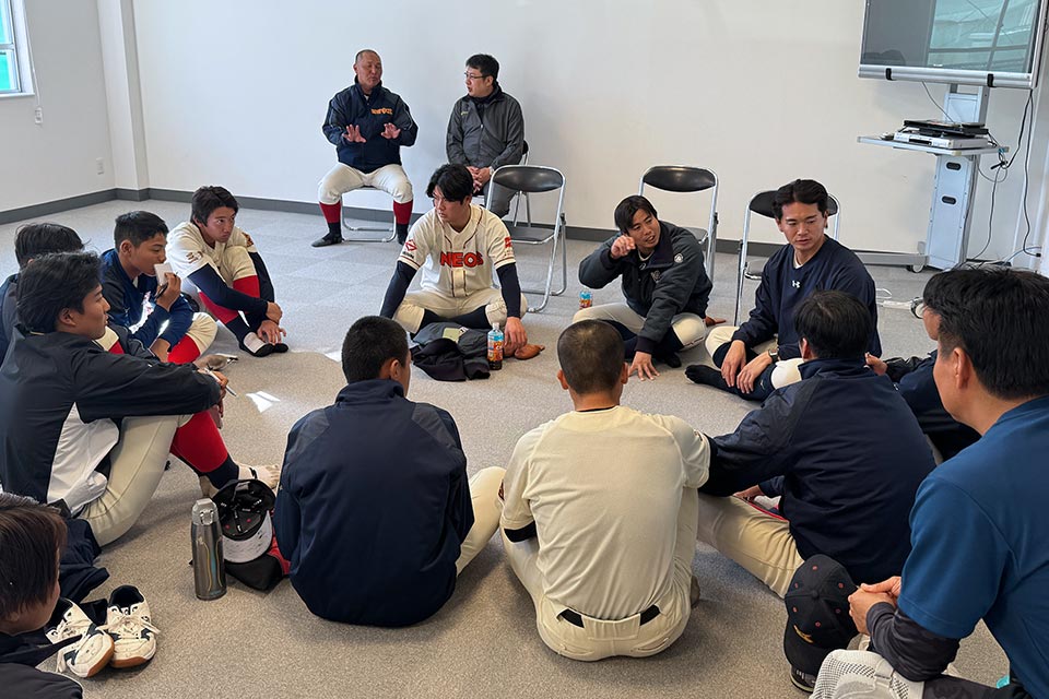 当日は天候に恵まれ、ウォーミングアップ、キャッチボール・ポジション別守備練習・バッティング・トークセッションと、参加選手との会話を大事にしながら、1つ1つ丁寧に指導を行いました。ENEOS野球部の選手から、実技指導を中心に高校生ならではの本格的な質問や、細かい動作の質問が多くあり、参加選手だけでなくENEOS野球部の選手からも真剣な表情が見受けられました。