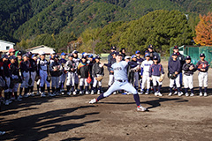 11月29日(土)岩手県山田町立山田中学校において、ENEOSリニューアブル・エナジー主催の「ENEOS野球教室」を開催しました。当日は、雲ひとつない快晴の空の下、同中学校野球部の中学生15名が参加。ENEOS野球部の選手5名に加え、同野球部出身の加藤投手の中学生時代のチームメートがサポートメンバーとして駆けつけ、地域とのご縁に感謝しながら教室がスタートしました。